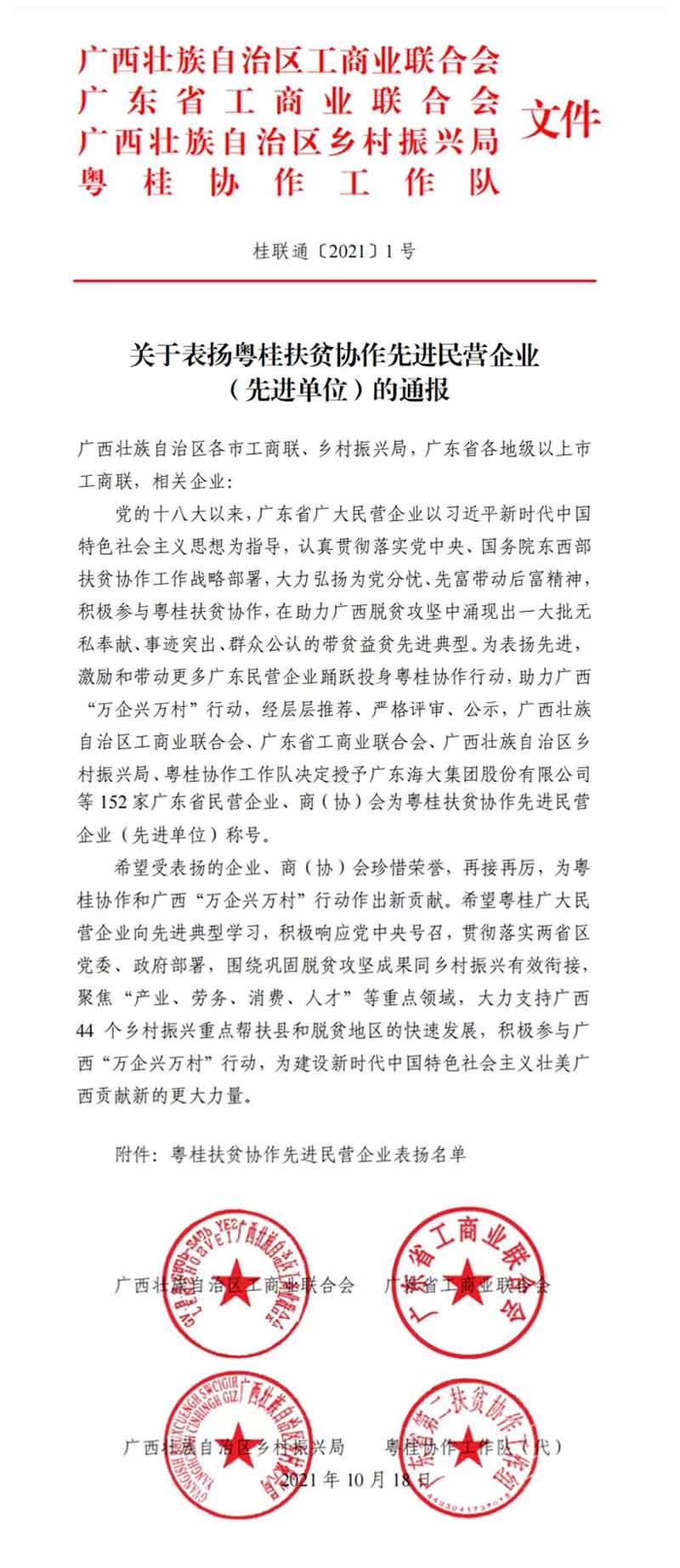 我司與其他151家企業、商協會被評為“粵桂扶貧協作先進民營企業(先進單位)”。